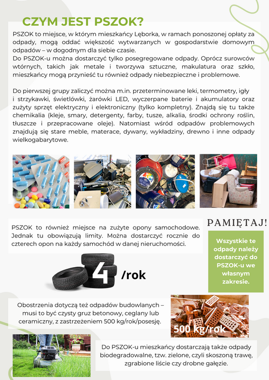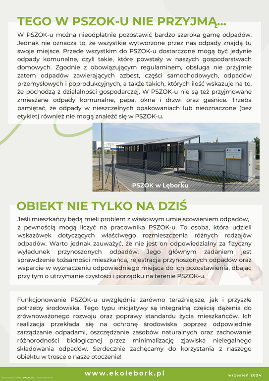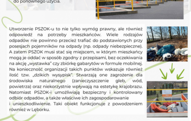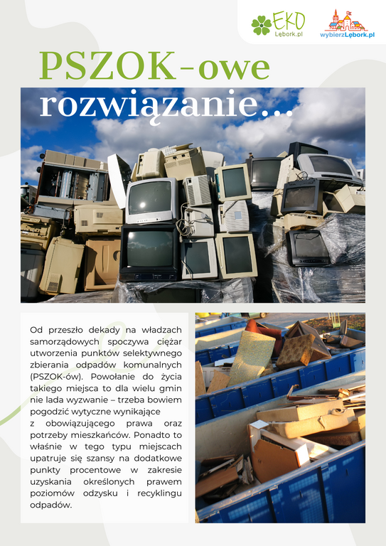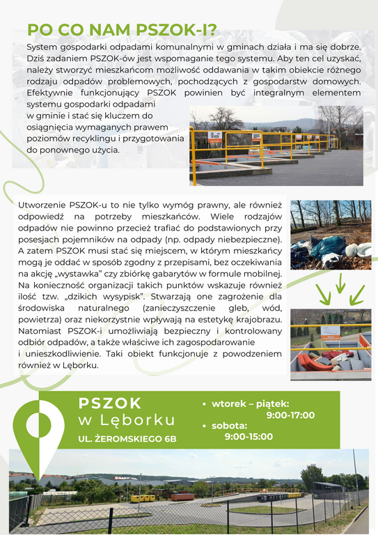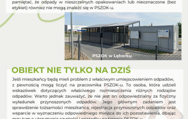 Punkt Selektywnego Zbierania Odpadów Komunalnych PSZOK to miejsce, w którym możemy pozbyć się selektywnie zebranych odpadów komunalnych bezpośrednio z nieruchomości niezależnie od terminów odbioru, wynikających z harmonogramów. Z PSZOK mogą korzystać nieodpłatnie mieszkańcy Lęborka, jeżeli uiszczają opłatę za gospodarowanie odpadami komunalnymi.